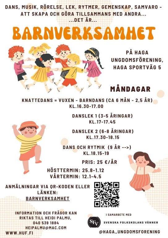 På DANS OCH RYTMIK-timmarna tar vi steget vidare från Danslekens innehåll och målsättningar. Vi kommer att bekanta oss med rytmikens grunder via dansen (och tvärtom), bekantar oss med olika sorters danser och dansstilar med betoning på sällskaps-, folk- och pardanser. Det centrala i verksamheten ligger i det sociala dansandet och vid sidan av det tränar man även allmän dansteknik. Verksamheten är främst riktad för 6+-åringar och uppåt. Att vara med kräver ingen tidigare danserfarenhet: kom som du är och ta dessutom kompisen med så blir vi ännu fler! Ju flera vi är desto roligare är det!